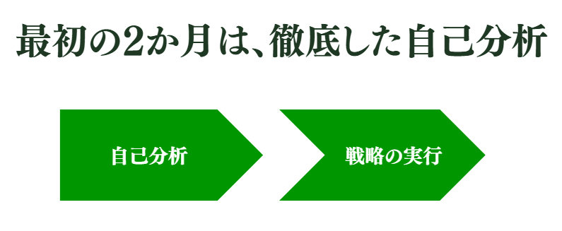 このコンサルティングでは、最初の2か月間をかけて、対話形式で徹底的な自己分析を行います。自己分析を通して、あなたの強みや価値観、そして行動妨げている無意識なブレーキを特定します。結果、なぜ売上が上がらなかったのかを根本から理解し、あなただけの成功法則を確立します。