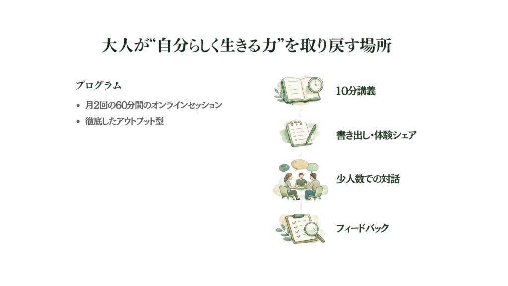 情報が溢れる現代だからこそ、一度立ち止まり、「自分と向き合い、感じ、言葉にし、仲間と共有する」。そんな体験を通じて、内側と外側の両面から自分を調えていきます。